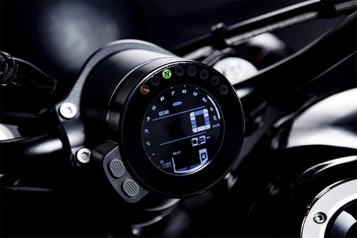 Массивные хромированные накладки на блоке цилиндров с обоих сторон, декоративные ребра на чёрных цилиндрах двигателя, заднее колесо, скрытое объёмистым крылом, и цифровая приборная панель, помещённая в небольшой круглый корпус, напоминающий ретро-спидометр. Бак и крылья дополнены минималистичной графикой жёлто-золотистого оттенка, а фара и поворотники имеют благородный ретро-вид: они круглой формы и заключены в отдельные обтекатели, при этом имея внутри мощную и яркую светодиодную оптику. Изящный V-образный стоп-сигнал рубинового цвета в хромированной окантовке достоин быть фрагментом ювелирного изделия.