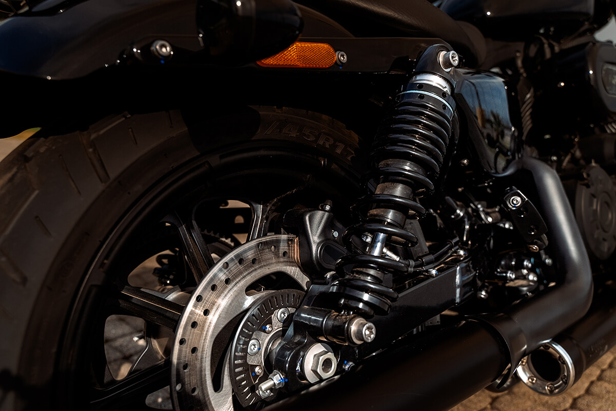 Широкая задняя покрышка не только хорошо смотрится, но и отлично реализует потенциал 800-кубового верхового V-твина. Передачу на ведущее колесо осуществляет ременной привод USA Gates. В совокупности всё это способно «поддать угля» на любой дороге.