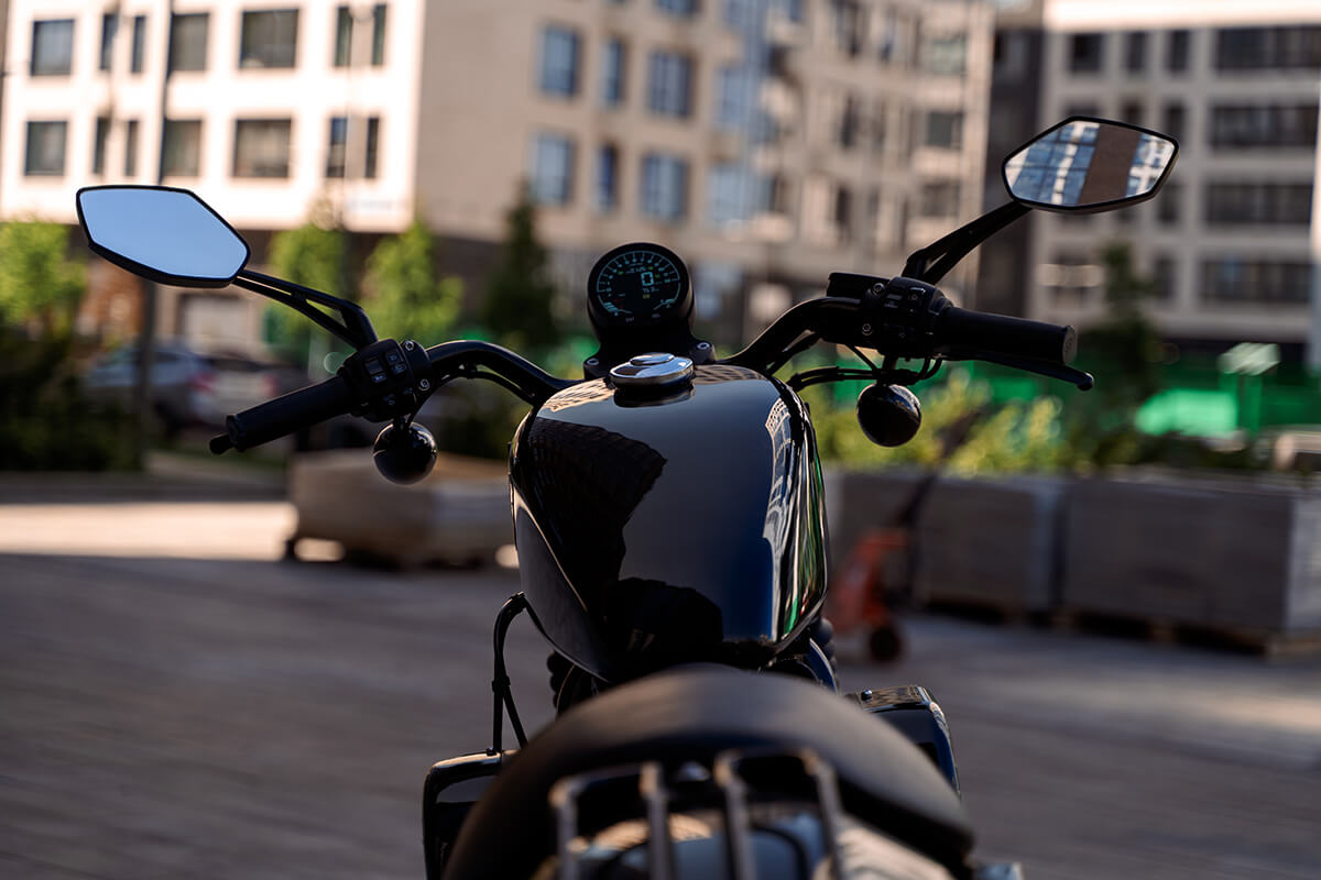 В глаза сразу бросается его агрессивный, приземистый силуэт с драгстерными мотивами. Весь мотоцикл исполнен в монохромной, радикально чёрной гамме. Супернизкий и узкий руль, компактные бак и сиденье, мультимедийная панель, заключённая в стакан от аналогового прибора, два ствола глушителей с изумительными патрубками на концах и притягивающая взгляд крышка корзины сцепления, напоминающая нечто из аэрокосмической области.