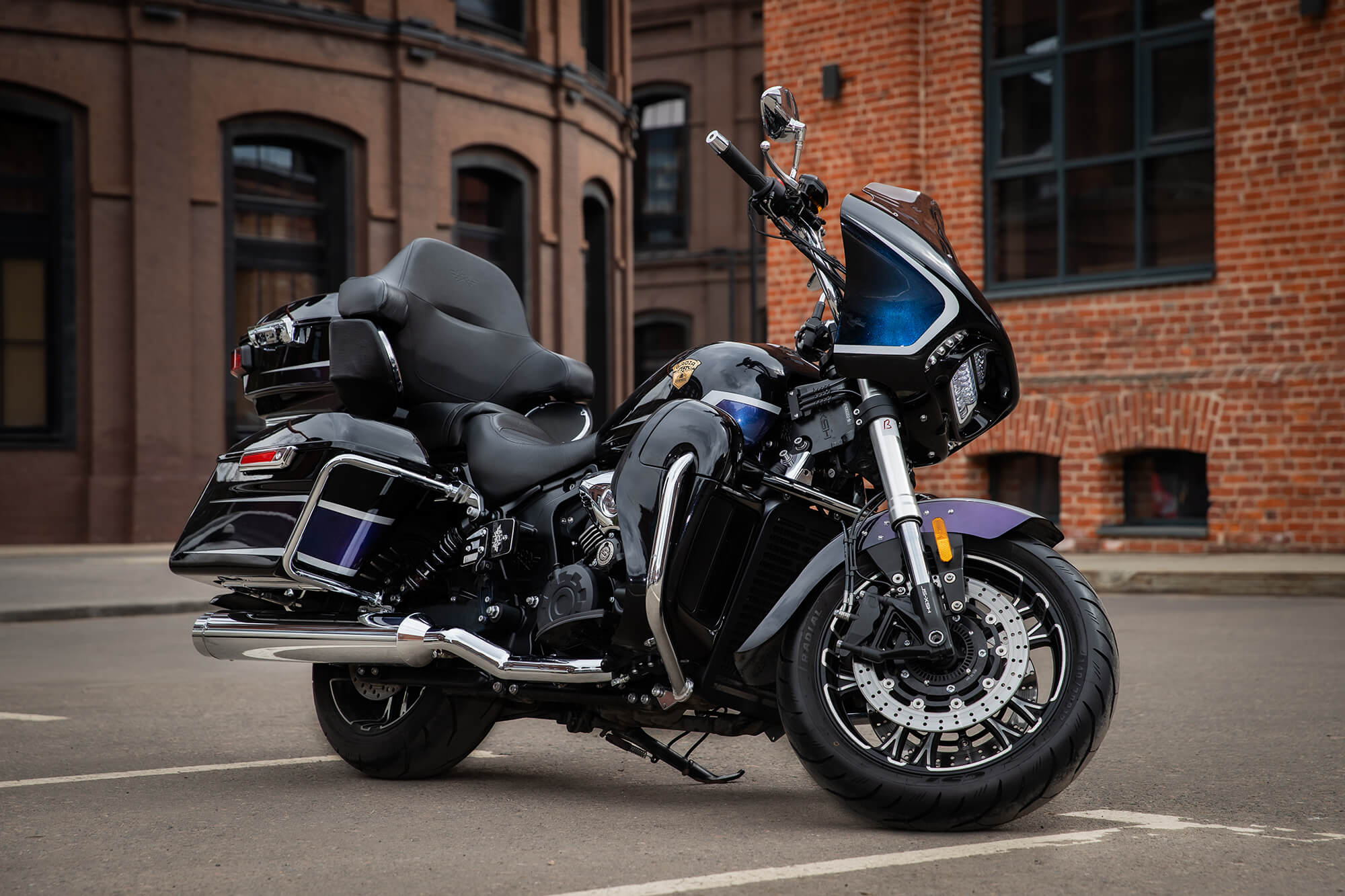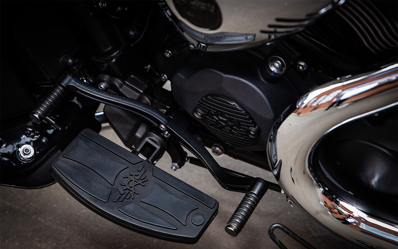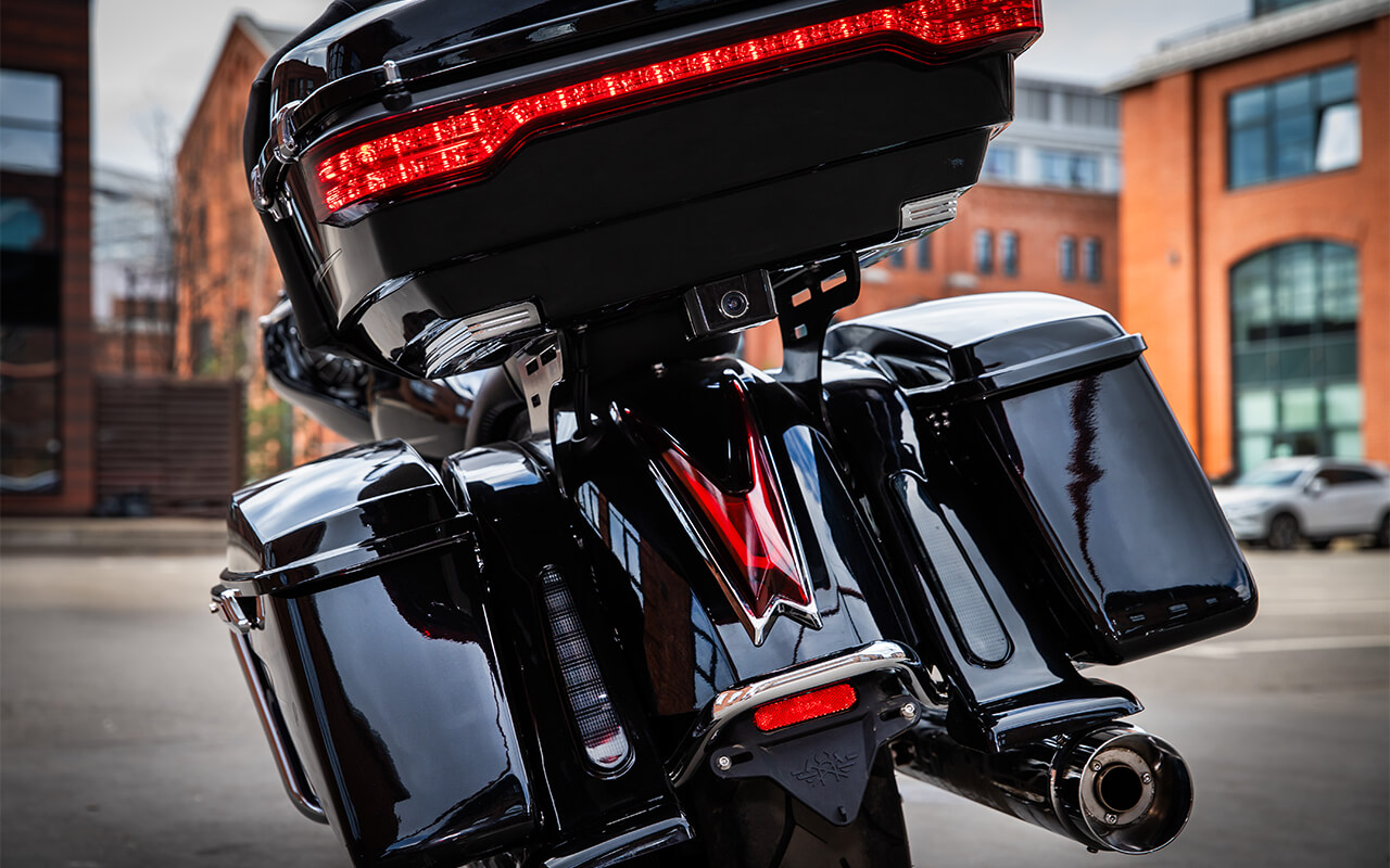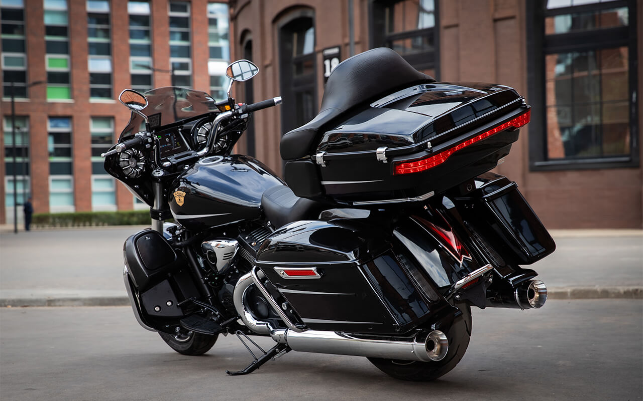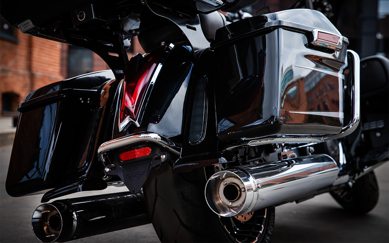 Сочетание матовых и глянцевых покрытий с хромированными элементами подчёркивает строгий и неудержимый характер модели, а массивные выхлопные трубы выражают динамический потенциал мотора.