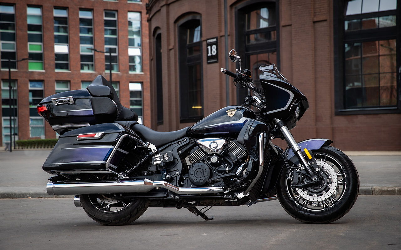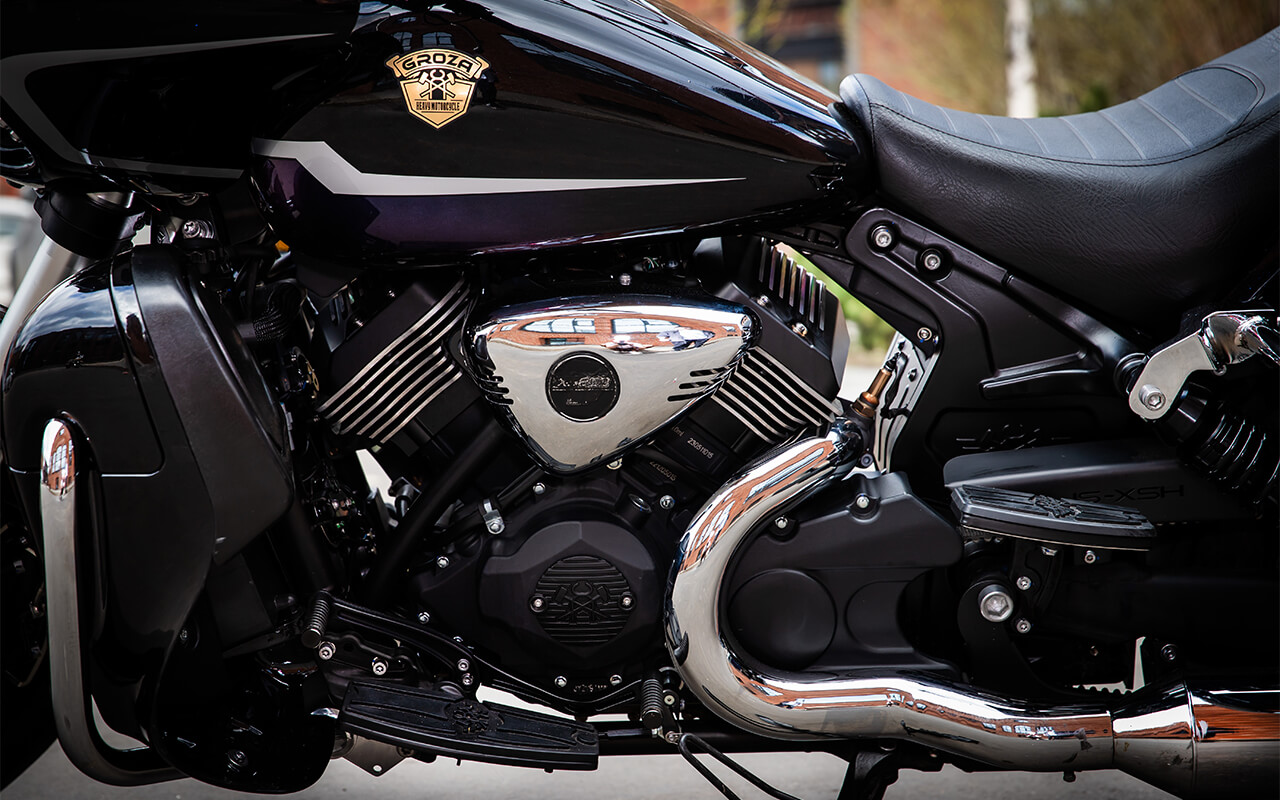 GROZA Traveller 800 – круизёр для максимального комфорта в дальних поездках: 800-кубовый V-твин, звуковая система, вместительные кофры и полный набор туристического оснащения, чтобы унести вас куда угодно, сохраняя уверенный ход и даря удовольствие от вождения.