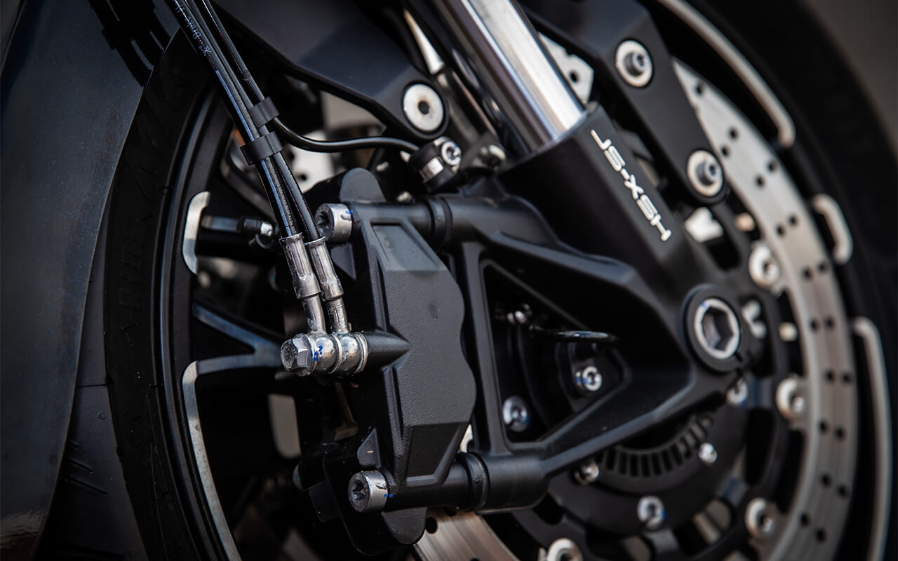 На оба колеса установлены гидравлические дисковые тормоза от NISSIN с 2-канальной ABS. Тормозная система обеспечивает чёткий отклик и эффективный сброс скорости даже в экстренных ситуациях.