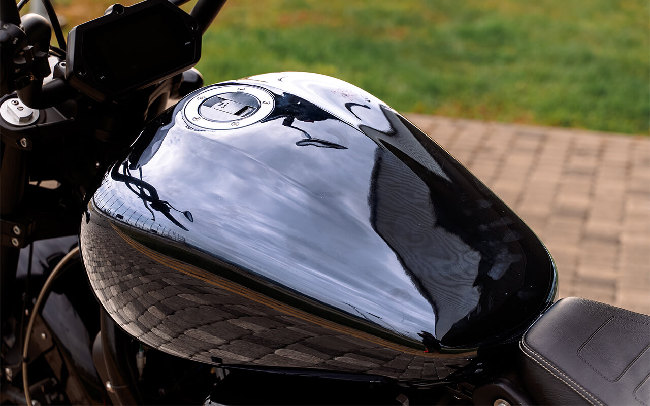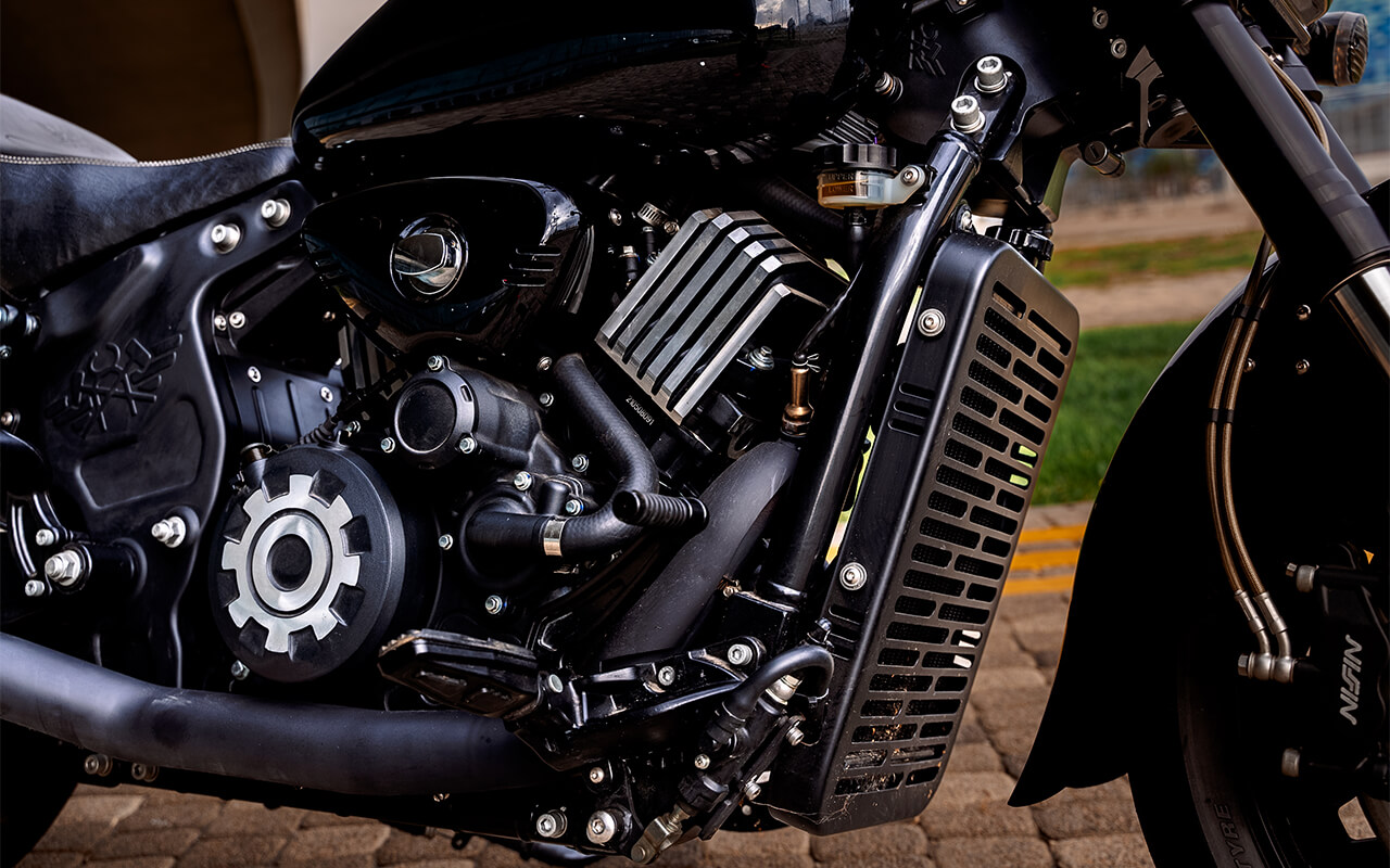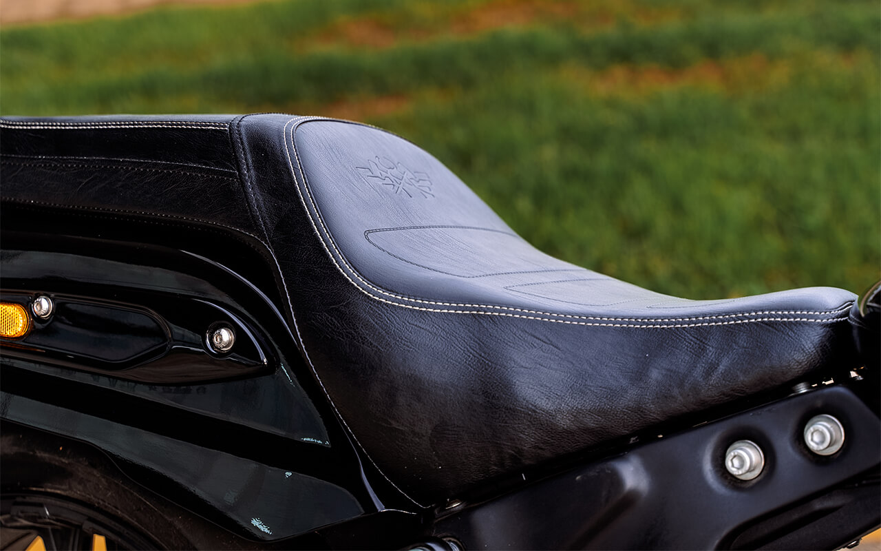 Узкая фара с мощным светодиодным блоком – один из современных трендов в мире круизёров – придаёт мотоциклу больше серьёзности и брутальности. Отсутствие лобового обтекателя и ветрового стекла дают пилоту сполна насладиться набегающим потоком и полнее ощущать скорость – 800-кубовый V-твин способен разгонять мотоцикл до 170 км/ч. Силуэт этого круизёра как раз рождён этим двигателем в середине композиции, изящной каплей бака и двумя глушителями чёрного цвета, симметрично разведёнными в стороны.