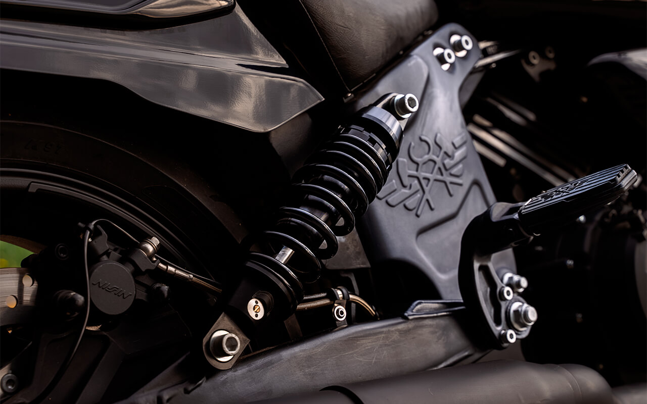 17-дюймовые колёса с литыми алюминиевыми дисками установлены на подвеску от YUAN. Подвеска спереди представлена телескопической вилкой перевёрнутого типа. Сзади установлено 2 регулируемых газонаполненных амортизатора.