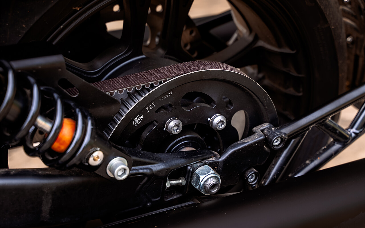 На мотоцикл установлена 6-ступенчатая механическая коробка передач. Привод на заднее колесо осуществляется ремнём от USA GATES. Ременной привод обеспечивает плавную передачу крутящего момента без металлического шума и снижает необходимость в частом обслуживании.