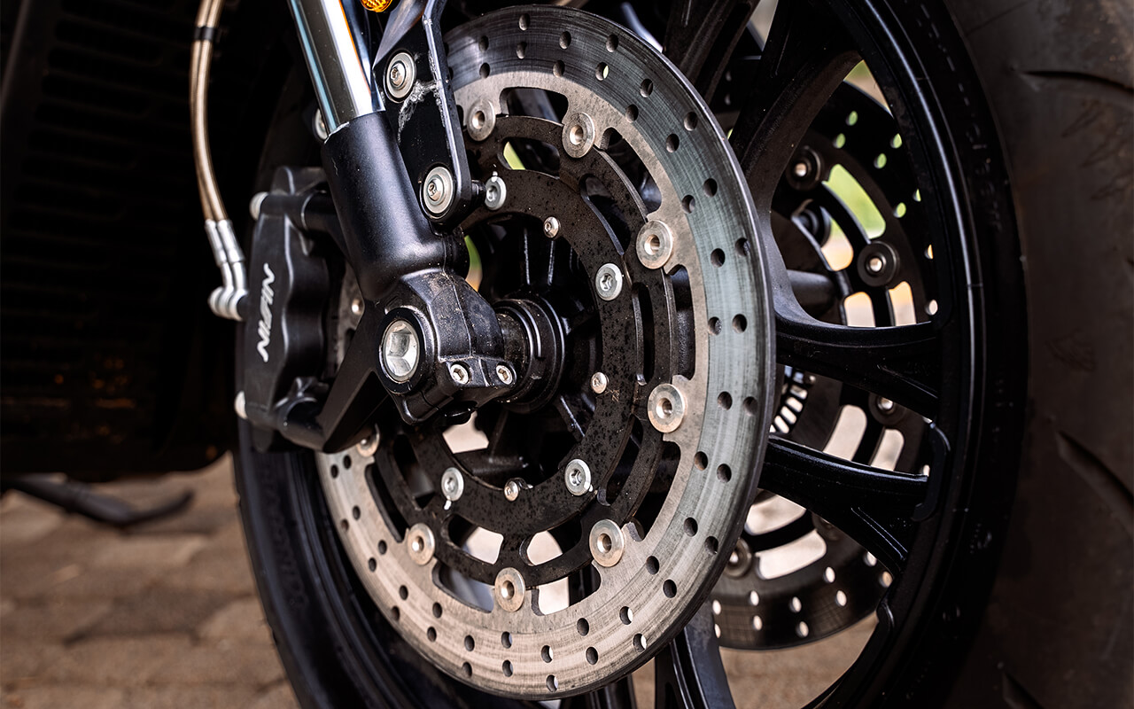 Спереди установлена пара 4-поршневых суппортов с тормозными дисками 320 мм, а сзади используется однопоршневой суппорт с плавающей скобой и диск 260 мм.